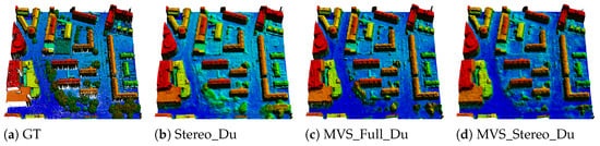 A 3D visualization of the DSMs is displayed in Figure 12. Rooftops are smoother and include less outliers in the Stereo_Du result. Besides, the vegetation is better represented as most of their surface is above ground level comparing with both MVS results. On the other hand, MVS_Stereo_Du and especially MVS_Full_Du compute a better estimation for pixels on the ground level, but they reduce significantly the expected surface for vegetation.