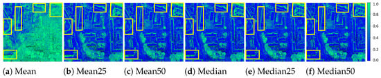 Dublin DSMs created with confidence based fusion - Stereo case. We show cases for mean fusion without confidence (a), with (b) and with (c). Similar cases are presented for the median in (d–f). Scale bar for the error is given in meters. Yellow rectangles highlight areas with significant differences.