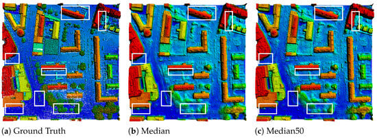 Generated DSMs for a Dublin region in a 3D representation—Stereo case. Region is the same as for Figure 13. We show three DSMs: ground truth, median fusion (no confidence based) and median fusion . Changes are highlighted with the white rectangles.