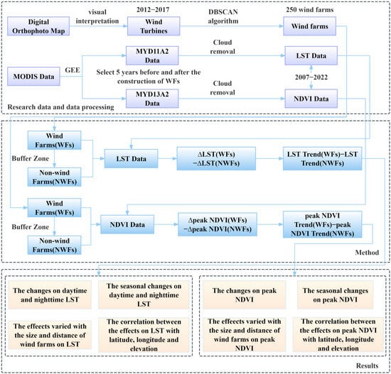We assumed that the WFs and natural factors jointly influenced LST within the WFs areas. In contrast, the LST in NWFs regions was solely affected by natural factors. Assuming that these natural factors exerted equal influence on both WFs and NWFs, the differential changes in LST between WFs and NWFs areas could be attributed to the WFs.