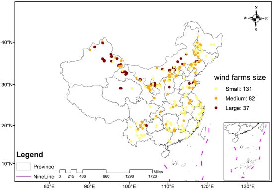 A total of 48,339 wind turbines and 250 WFs were selected. These WFs are generally evenly distributed across all provinces except Beijing, Hainan, and Tibet (Figure 3). The wind farms that also incorporate photovoltaic panels were excluded. The wind turbines located away from areas with human activities were preferred. According to the three principles, we identified 48,339 wind turbines. We employed the Density-Based Spatial Clustering of Applications with Noise (DBSCAN) algorithm to group individual wind turbines into WFs clusters []. The DBSCAN is a density-based clustering algorithm that relies on two key parameters: the search radius and the minimum number of points required to form a cluster. Specifically, the search radius was set to 0.1 km, and the minimum number of points was set to 5. As a result, the initial 48,339 wind turbines were clustered into 250 WFs. The 250 WFs were further categorized based on the number of turbines they contained: the small WFs (less than 100 turbines), the medium WFs (101 to 300 turbines), and the large WFs (more than 300 turbines).