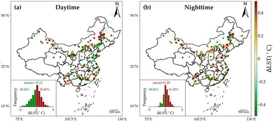 Effects of WFs on annual mean daytime (a) and nighttime (b) LST. The insets display histograms of ∆LST for 250 WFs across China, including mean values and the proportions of positive (dark red) and negative (green) values.