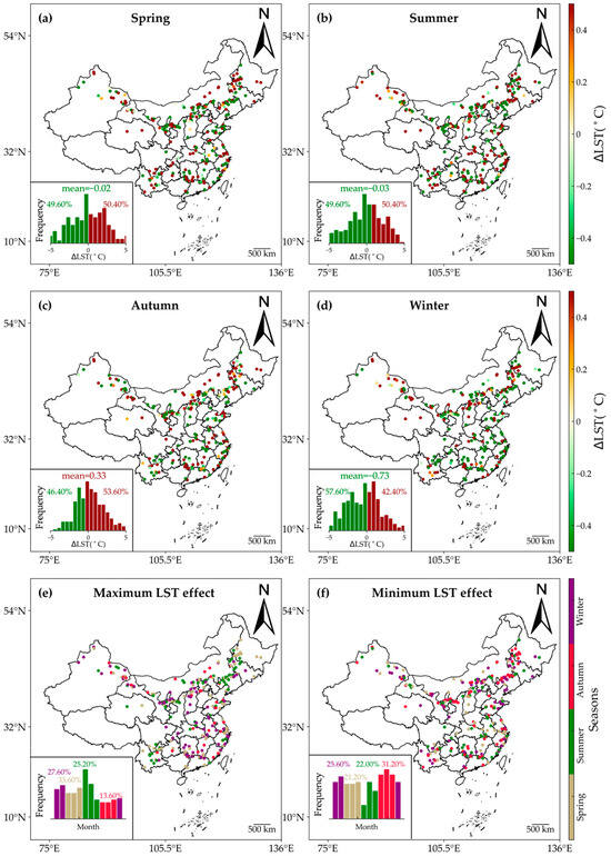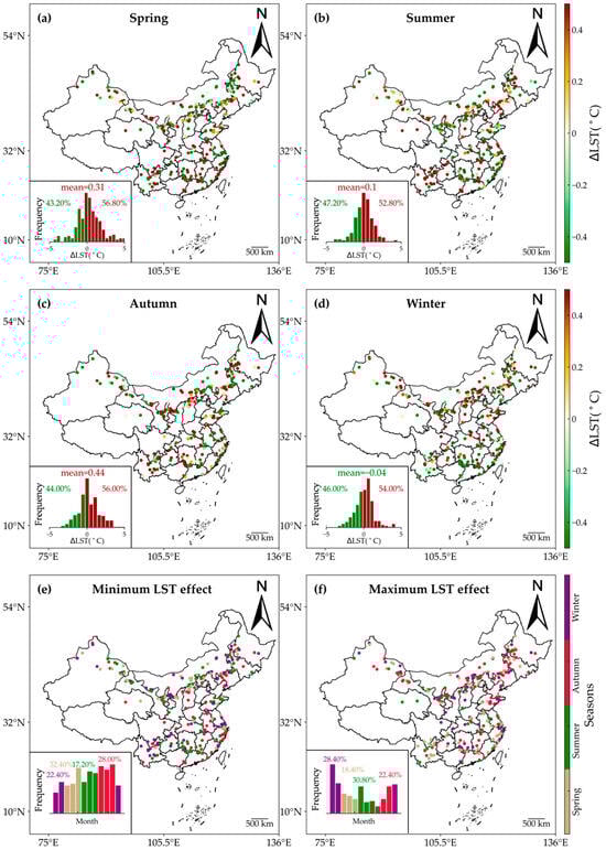 Seasonal variations in the daytime effects of WFs on LST. The effects of WFs on daytime LST are shown for spring (a), summer (b), winter (d), and autumn (c). (e,f) show months with maximum and minimum ∆LST. The insets provide histograms of the months with the highest and lowest ∆LST values.