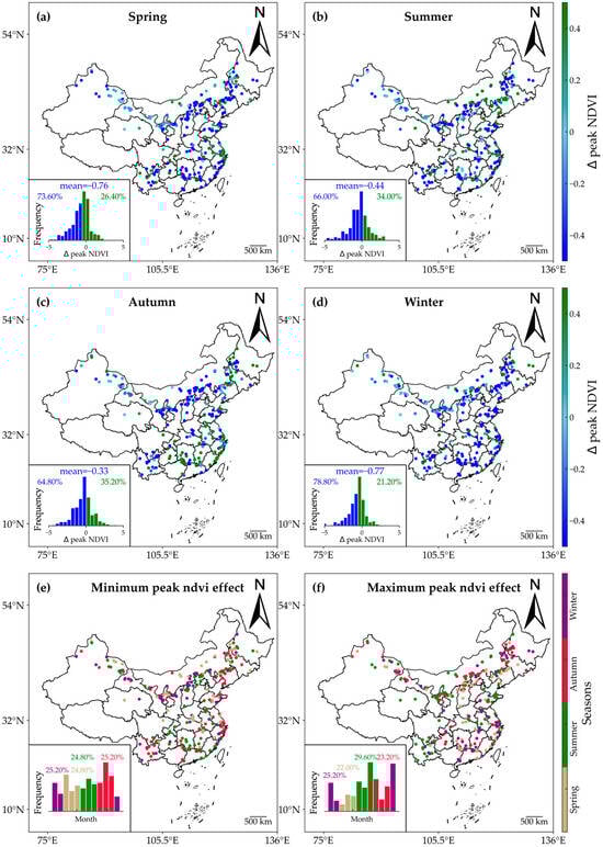 Seasonal variations in the effects of WFs on peak NDVI. The impacts on peak NDVI are shown for spring (a), summer (b), winter (d), and autumn (c). (e,f) show the minimum and maximum months of ∆peak NDVI. The insets show histograms of the months with the lowest and highest ∆peak NDVI values.