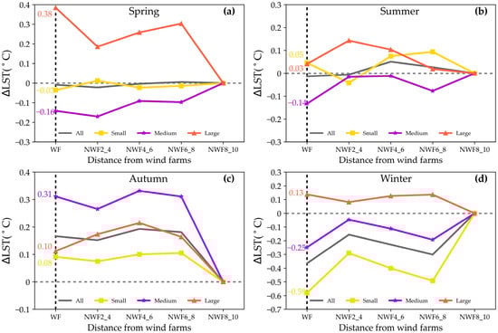 The impacts of WFs on daytime LST were significantly influenced by proximity. Specifically, during spring, autumn, and winter, the effects of small, medium, and large WFs on LST exhibited a consistent pattern: initial decrease, subsequent increase, and final decrease with distance. For instance, in spring, the ∆LST decreased from 0.38 °C within the WFs areas to 0.18 °C at 2–4 km, and then increased to 0.27 °C at 6–8 km before declining to 0 °C at 8–10 km. The impacts of large WFs on LST during summer followed a pattern of initially increasing and then decreasing with distance, with the ∆LST rising from 0.03 °C within the WFs areas to 0.12 °C at 2–4 km before declining to 0 °C at 8–10 km. Notably, the influence of small and medium WFs on LST exhibited a trend of decreasing, then increasing, and subsequently decreasing with distance. For instance, the ∆LST of small WFs decreased from 0.05 °C within the WFs areas to −0.03 °C at 2–4 km, increased to 0.08 °C at 6–8 km, and then decreased to 0 °C at 8–10 km.