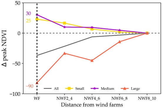 Figure 12 illustrates the impacts of WFs on vegetation, considering both WFs sizes and distances. Within the WFs areas, the large WFs had a negative impact on vegetation, whereas the small and medium-sized WFs exhibited a positive influence. Analyzing the ∆peak NDVI values revealed that the most significant impacts on vegetation occurred with the large WFs, resulting in a peak NDVI reduction of 0.009 (p < 0.05). In contrast, the small and medium-sized WFs had lesser impacts on vegetation, with increases of 0.0025 and 0.003, respectively.