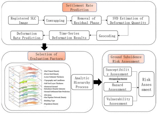In this paper, the risk assessment of ground subsidence combines long-term InSAR observation results with triggering factors. The technical process is shown in Figure 2.