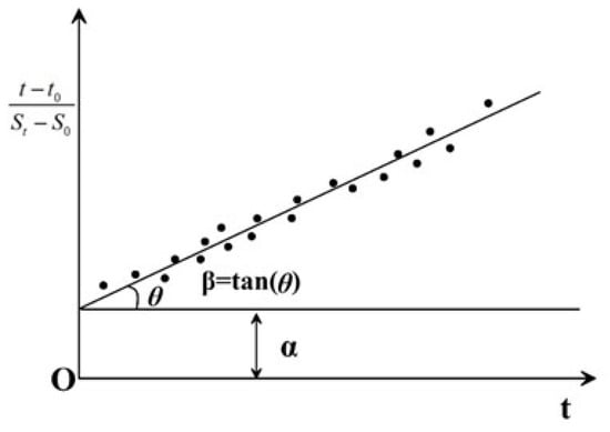 The method of least squares is used to fit the curve results in a line that approximates the actual observed data very closely. The slope of the line is the β value, and the intercept is the α value. Therefore, to estimate the settlement at a specific moment, this line can be extended to the predicted time point, and the calculated value is