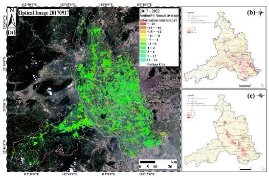 (a) SBAS-InSAR results in Foshan City; (b) distribution of soft soil in Foshan City; (c) distribution of sandy soil in Foshan City.
