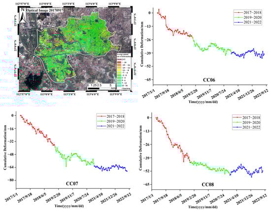 In this paper, using SBAS-InSAR technology to monitor the ground subsidence in Foshan City, a total of 214 subsidence areas were identified across five districts. The maximum subsidence rate reached −35 mm/yr (Figure 5a). The majority of large-scale and extensive ground subsidence in Foshan City is mainly concentrated in areas with medium and thick layers of soft and sandy soil (Figure 5b,c). The spatial distribution characteristics of subsidence are similar to those of historical ground settlement intensity, different building types, and human engineering activities. Figure 6 shows the InSAR monitoring results of the subsidence trend of the typical sample points on the ground in Chancheng District, Foshan City, indicating that the changes in ground subsidence patterns over time are consistent with the development of the hyperbolic curve. So, the hyperbolic model is chosen as the prediction method, as it is suitable for the numerical prediction of the subsidence inflection point and the numerical prediction after the inflection point.