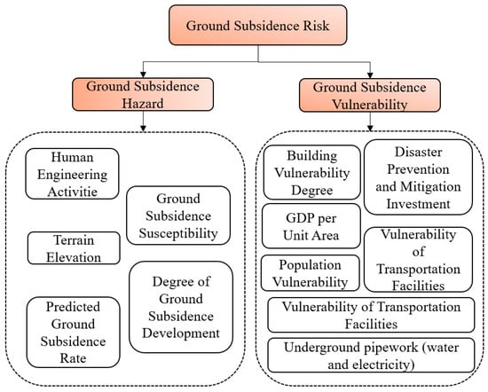 Based on the research results, the ground subsidence risk evaluation index system for Foshan City is divided into three objective levels []: one primary index (ground subsidence risk), two secondary indices (ground subsidence hazard and ground subsidence vulnerability), and twelve tertiary indices (human engineering activities, ground subsidence susceptibility, terrain elevation, degree of ground subsidence development, predicted ground subsidence rate, building vulnerability degree, GDP per unit area, population vulnerability, vulnerability of transportation facilities, disaster prevention and mitigation investment, vulnerability of transportation facilities, underground pipework (water and electricity)), as shown in Figure 7.
