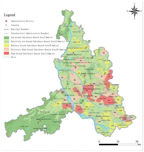 By combining the monitored subsidence rates in Foshan, the predicted subsidence rates and the factors such as human engineering activities and topographic elevation, we conducted a hazard assessment. Finally, using spatial analysis tools such as spatial clustering, post-classification processing, and curve smoothing, the evaluation results were generalized to produce the final ground subsidence hazard assessment zoning map of Foshan City (Figure 8). The corresponding subsidence rates from high-hazard areas to low-hazard areas are as follows: >12 mm/yr, 9~12 mm/yr, 6~9 mm/yr, 3~6 mm/yr and <3 mm/yr, respectively. Among them, the proportions of high-hazard (A area) and relatively high-hazard areas (B area) are 8.28% and 9.26%, respectively.
