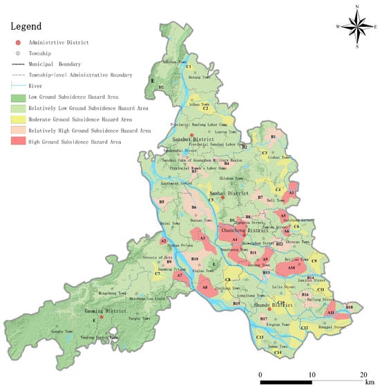 Based on the actual indicators of various districts in Foshan City, a classification was conducted. Using the analytic hierarchy process, factor weights were determined, and finally, the ground subsidence vulnerability assessment results for Foshan city were calculated. The results were then classified using the Natural Breaks (Jenks) method for grading and rendering the map []. This method divides the levels based on the natural grouping of values, achieving the best intra-group similarity and the maximum inter-group variability. The results were divided into five levels from low to high, resulting in the vulnerability assessment analysis map of Foshan City (Figure 9). The proportions of the area from high-vulnerability zones to low-vulnerability zone were as follows (from A to E area): 9.53%, 7.57%, 13.07%, 48.42%, and 21.41%, respectively. The high- and relatively high-vulnerability zones are mainly concentrated in the eastern part of Chancheng District and the southern part of Nanhai District, which is in accordance with underground pipelines, transportation tracks, and residential areas.