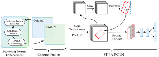 ST-PA_RCNN based on channel fusion is proposed in this subsection, where channel fusion is one of the primary methods of pixel-level fusion [58]. Channel fusion enriches detailed information by combining different feature channels or image channels to form a comprehensive feature representation. The structure of the ST-PA_RCNN based on pixel-level fusion is shown in Figure 6. The scattering feature enhancement region obtained from the original images after scattering feature enhancement is input into the backbone network through channel fusion.