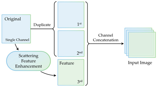 In this study, channel fusion was conducted by concatenating the original image and feature image after scattering enhancement, where the third channel of the original image is replaced with the feature image. The process of channel fusion is shown in Figure 7.