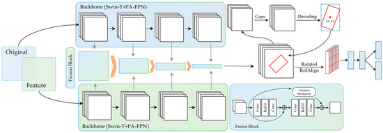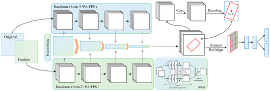 In this paper, the backbone network Oriented RCNN [55] based on the Swin Transformer and PA-FPN is named ST-PA_RCNN. Its structure is shown in Figure 4. Oriented RCNN is a simple and efficient generic two-stage network for rotation detection possessing good accuracy and timeliness, with feature extraction composed of CNN kernels. However, due to the limited receptive field of the CNN kernels, they only capture local features within the region covered by the kernels, which cannot effectively meet the higher-quality feature extraction requirements especially in complex scenes. In this regard, the Swin Transformer can capture long-range dependencies through a self-attention mechanism without using CNN kernels, providing a more global perspective. The Path Aggregation Feature Pyramid Network (PA-FPN) [56], an improved Feature Pyramid Network (FPN) [57], is conducted for enhancing feature extraction through path augmentation.