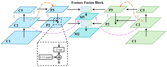 The structure of PA-FPN is shown in Figure 5, which enhances information flow between different scale features by bottom-up path augmentation based on the FPN, especially for the better performance of multiple-scale target detection in a complex background. PA-FPN mainly consists of an FPN and bottom-up path augmentation.