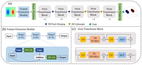 (a) Three-dimensional ST overall network architecture. (b) Feature extraction module. (c) Swin Transformer block.