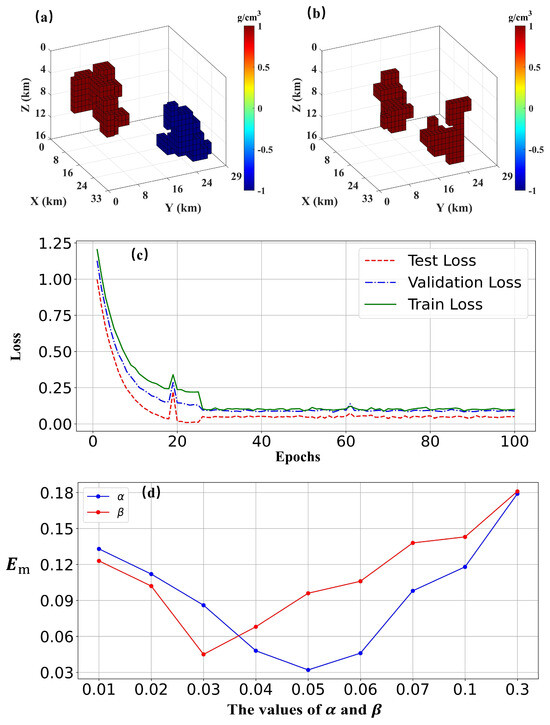 In this study, the subsurface space was divided into 32 × 32 × 16 cubes, with each cube sized 1.03 × 0.90 × 1.00 km to match the dimensions of the measurement area. A total of 30,000 random models and their corresponding gravity anomalies (Figure 2a,b) were generated using the random walk method and forward modeling to serve as the training and validation datasets. The residual density of the models was set to , with a background field of 0. The random walk method divided the subsurface space into four symmetric parts (top, bottom, left, and right). At least one part was randomly chosen as a starting point, which then moved one step in a random direction. A total of s () steps were taken to generate a 3D model. This highly randomized dataset approximates any gravity source, forming a strong foundation for training a robust network. Additionally, 2000 regular datasets, which were not included in the training dataset, were created as the test dataset and fed into the network at a ratio of 14:1:1. The loss function curve of the network is shown in Figure 2c.