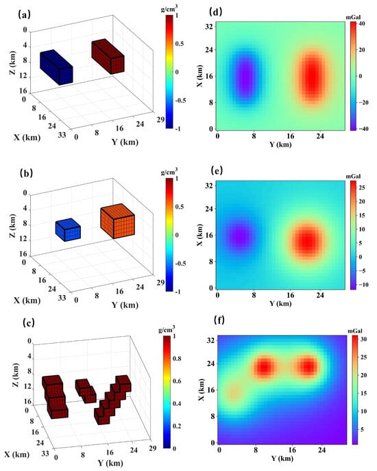 Synthetic model and its forward modeling results. (a) Model 1. (b) Model 2. (c) Model 3. (d–f) show the forward modeling results of (a), (b), and (c), respectively.