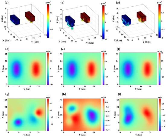 Comparison of inversion results of Model 1. Three-dimensional inversion models from (a) 3D ST, (b) 3D U-net, and (c) 2D U-net. Forward results of inversion model from (d–i) represent the residuals between (d–f) and the actual gravity anomalies (showing absolute density > 0.11 ).