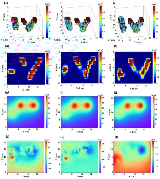 Comparison of inversion results of Model 2. Three-dimensional inversion models from (a) 3D ST, (b) 3D U-net, and (c) 2D U-net. (d–f) are slices of the corresponding inversion results, located at X = 12 km. Forward results of inversion model from (g–l) represent the residuals between (g–i) and the actual gravity anomalies (showing absolute density > 0.11 ).