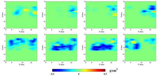Slices of inversion result. The slice positions from left to right are X = 2, 6, 12, 18, 21, 24, 26, 28 km.