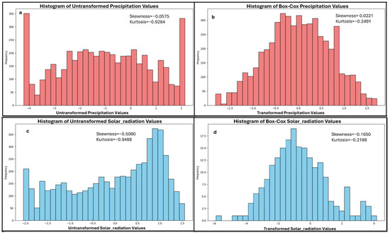 | Precipitation | Box-Cox Transformation | None | Removal of extreme outliers |