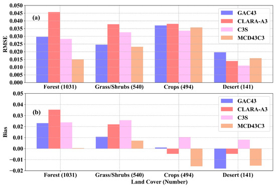 - Lellouch, G.; Carrer, D.; Vincent, C.; Pardé, M.; Frietas, S.C.; Trigo, I.F. Evaluation of two global land surface albedo datasets distributed by the copernicus climate change service and the EUMETSAT LSA-SAF. Remote Sens. 2020, 12, 1888. [Google Scholar] [CrossRef]