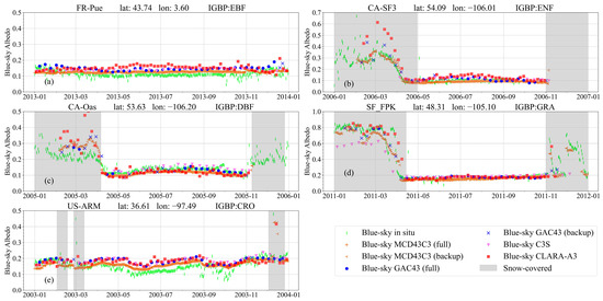 - Cescatti, A.; Marcolla, B.; Vannan, S.K.S.; Pan, J.Y.; Román, M.O.; Yang, X.; Ciais, P.; Cook, R.B.; Law, B.E.; Matteucci, G. Intercomparison of MODIS albedo retrievals and in situ measurements across the global FLUXNET network. Remote Sens. Environ. 2012, 121, 323–334. [Google Scholar] [CrossRef]