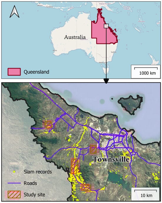 This study focuses on the Townsville local government area, Queensland, Australia, a seasonally dry area of Australia with summer-dominated rainfall. Siam weed was reported in the Townsville area in 2003 [9], with the ongoing discovery of infestations across large areas and in multiple river catchments [14,43] (Figure 1). The species is presently classified as a category 3 restricted invasive plant under the Biosecurity Act 2014 in Queensland.
