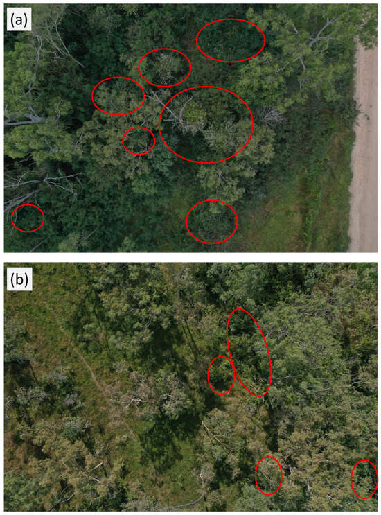 An example of representative image dataset captured during the overcast (a) and sunny conditions (b). The images were roughly annotated using red ovals to highlight presense of Siam weed.