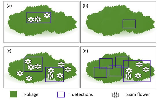 For the purpose of this study, true/false positive/negative are defined in the context of image tile and not individual bounding box or individual flowers. This is primarily due to the nature of the plant which often overlaps with adjacent plants and form a complex scene where the plant boundary is not distinct. So, quantifying accuracies at the individual flower or individual bounding box levels were considered less important. There were cases where the model made both correct and incorrect detections (bounding boxes) within a single tile. In such cases, the result was scored based on whether the model had more correct or incorrect detections for that image tile. For example, in Figure 3d, the model made several false positive detections over a patch of non-Siam weed vegetation and at the same time made a true positive detection on a patch of Siam weed; in this case, the model is considered to have made a false positive detection because, on the image tile level, the model has made more incorrect detections (Figure 3). The five independent validations were then averaged to derive accuracy metrics to minimise observer bias.