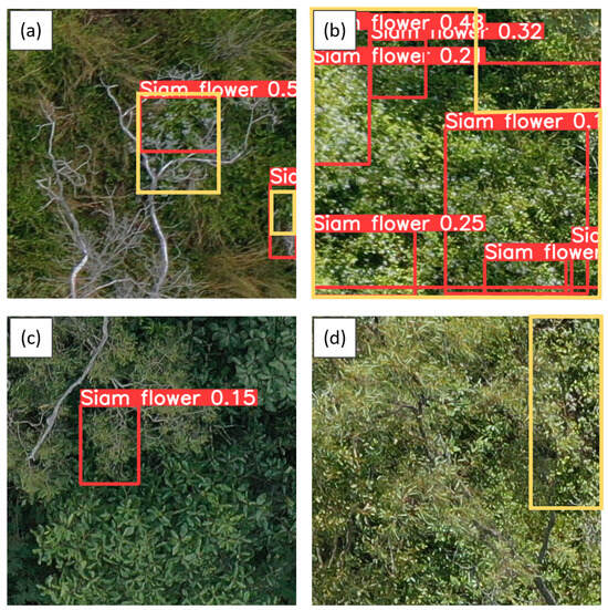 YOLOv5 Siam weed detections from the UAV images. The red bounding box represents the extent, the values represent the model’s confidence for each detection, and yellow bounding box represents authors’ annotation for comparison. The panels show (a) true positive tile in overcast conditions, (b) true positive tile in sunny conditions, (c) false positive tile, and (d) false negative tile.
