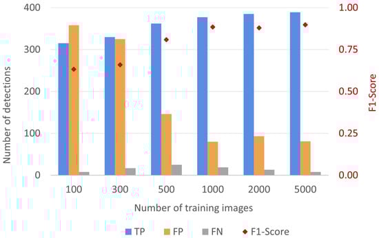 The number of training images was a crucial parameter for an accurate detection model. The comparison in Figure 5 demonstrates the improvement in the model accuracy (F1-Score) with the increasing number of input training images. When the number of input training images was increased in steps from 100 to 5000, the model accuracy revealed a trend of rapid improvement in accuracy initially, followed by an inflection point and saturation of accuracy. With fewer than 1000 images, the model had a reduced F1-Score and an increase in false positives, indicating insufficient input training images to develop a robust model. When the model was trained with over 1000 training images, the model again showed marginal to no improvement in accuracy (F1-Score of 0.88, 0.88, and 0.90 for 1000, 2000, and 5000 training images, respectively), indicating that perhaps the model had been trained on sufficient images. The model trained with 1000 training images was of particular interest, as it indicated an optimal balance between model performance, the requisite amount of training data, and the computational burden to train the model with a larger number of images. This inflection point at 1000 input training images was also associated with a drastic decrease in false positive detections and an increase in true positive detections compared to the lower number of input images (Figure 5).