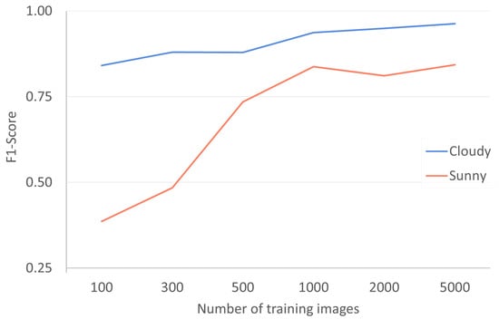 Graph showing the YOLOv5s detection performance on a sunny image dataset (red) and an overcast image dataset (blue). The model performance is illustrated with the accuracy metric F1-Score.