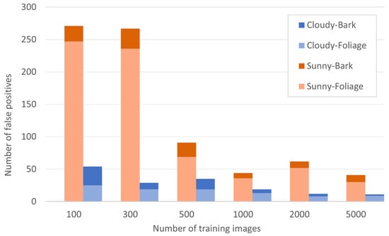 The sources of false positives were classified as foliage (which mainly contained leaves in trees and grass) and bark (which contained bare branches and twigs), as illustrated in Figure 7. The false positives were also classified by image capture conditions—sunny or overcast. There was a notable reduction in false positives when the image capture conditions were overcast. In fact, false positives dropped by 80% from 271 to 54 for the worst model (a model developed using 100 image tiles as input training images) and by 73% from 41 to 11 for the best model (a model developed using 5000 image tiles as input training images) (see Figure 8). There were also some false positives originating from irregular pixels, which included a high reflection from pebbles, water, rocks, etc. However, the number of these irregularities was minor, accounting for less than 10% of total false positives. Foliage was the largest source of false positives for images under sunny conditions (82% on average), followed by bark (18% on average). It appears that sun glints and reflection from foliage can be confused with Siam weed flowers by the detection model in sunny conditions. Under cloudy conditions, the proportion of false positives from foliage was lower but remained the primary source of false positives (64% on average), being sometimes on par with the false positives from bark.