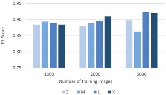 In most cases, the larger models performed better than the smaller models, but there were exceptions to this trend (such as with the 1000 training image model). For the models trained using 1000 images, there was no improvement in model performance when switching to a larger model, as all models performed within an F1-Score of 0.88–0.89. For the models developed using 2000 input training images, there was a clear benefit in using a larger model, with consistent improvement in the F1-Score (0.87 for the small model and 0.91 for the extra-large model). The larger models performed better when trained with 5000 images, although there was a reversal trend for the medium model, which performed more poorly than the small model. Model accuracy was very consistent across all models investigated—with an accuracy (F1-Score) ranging from 0.86 to 0.92 (Figure 9). The YOLOv5X model trained with 5000 and 2000 images and the YOLOV5L model trained with 5000 images had the highest performance accuracy, with an F1-score of 0.91–0.92. While there was a benefit in using the YOLOv5X model trained with 5000 images, these findings also provide confidence that the YOLOV5S model trained on 1000 images performed relatively well compared to larger models with many more training images.