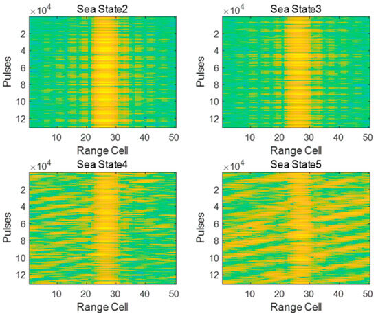 The targets corresponding to the Naval Aviation University shared dataset and the Yantai airborne test data are a buoy and a ship, respectively, both of which are stationary targets. To further verify the proposed method’s detection performance for moving targets and multiple targets, simulated moving targets were added to the clutter background of sea state 4 data. The expression for the simulated target is given in Equation (39).