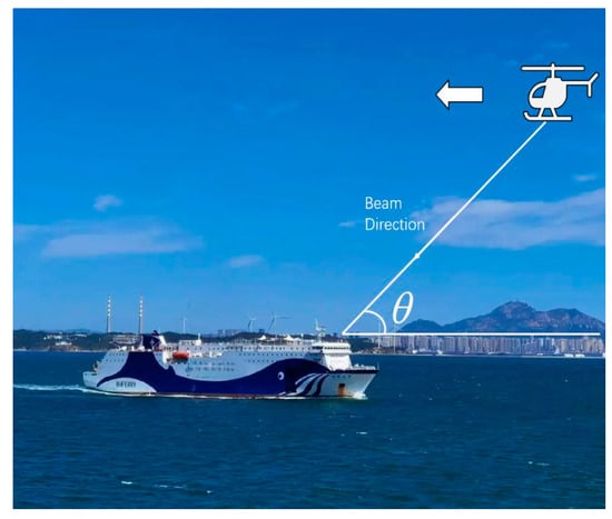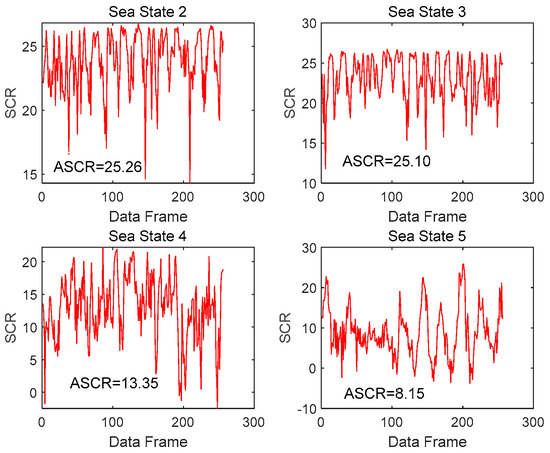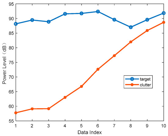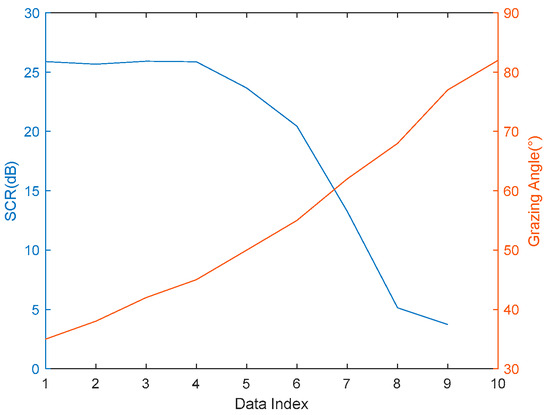 The schematic diagram of data collection for airborne test scenarios in Yantai is shown in Figure 4. represents the grazing angle of the radar beam. As the aircraft gets closer to the ship, continuously increases. The time-domain radar echo schematic is illustrated in Figure 5. In post-processing, velocity compensation is performed every 64 pulses (that is to eliminate the Doppler frequency shift caused by its average radial velocity within the pulse, in order to approximately eliminate the impact of the moving platform on the detection), ensuring data coherence within these 64 pulses. To facilitate the study of characteristics under different grazing angles, the data are divided into nine segments, each containing 40,960 pulses. The relationship between and the SCR is shown in Figure 6. Each segment corresponds to a specific range of grazing angles from one data sequence to the next. It can be observed that when is below 45°, the SCR remains almost constant. When exceeds 45°, the SCR begins to decrease. As the grazing angle surpasses 55°, the SCR decreases sharply. When exceeds approximately 68°, the SCR reduction slows down. The power levels of the target and clutter corresponding to the data are shown in Figure 7. It can be seen that as the grazing angle increases, the target power level remains relatively stable, while the clutter power level continues to increase. The reason lies in the fact that as the grazing angle increases, the clutter scattering coefficient strengthens, and the scattering area corresponding to each unit distance cell increases. This is the main reason for the low target SCR caused by changes in the grazing angle [14].