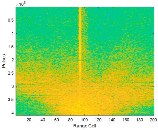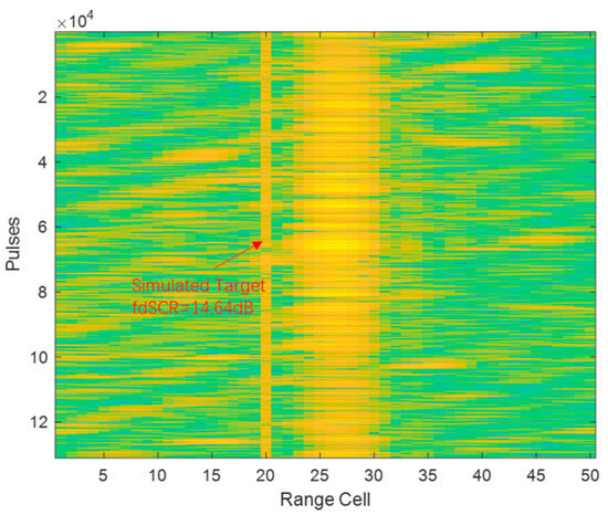 Here, represents the amplitude of the signal, and its size is adjusted to control the SCR of the data. is the frequency of the added signal. A simulated target with = 15,000 and = 93 Hz is added near the buoy, corresponding to a slow-moving boat with a speed of approximately 6 knots. It is assumed that the target echo occupies only one range cell. The time-domain echo after adding the target is shown in Figure 29. Since this is a single-frequency target, the frequency domain Signal-to-Clutter Ratio (fdSCR) is calculated using Equation (40), yielding a value of 14.64 dB.