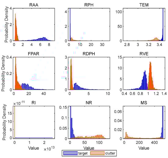 The mean and variance reflect the central tendency and the degree of fluctuation of a feature, respectively. Figure 8 illustrates the distribution of nine features for targets and clutter under sea state 2. It can be observed that, although most of these features deviate from a normal distribution, they exhibit a certain clustering structure—concentrating around the mean and becoming more dispersed as the distance from the mean increases. To achieve better separation between targets and clutter, the mean difference between the two should be as large as possible, and the variance should be as small as possible. To avoid the influence of differences in feature magnitudes on the statistical analysis, normalized mean and CV are introduced for analysis. The normalized mean and CV for clutter and targets are calculated as follows: