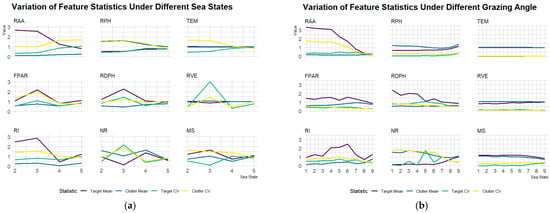 Statistical metrics of features under different datasets. (a) Different sea states. (b) Different grazing angles.