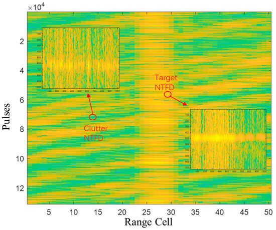 represent the PDFs of the features in clutter and target data, respectively. Physically, this indicates the degree of overlap between the two distributions. When the Bhattacharyya distance (BD) is large, it means a small overlap, indicating better separability of the feature. Conversely, a smaller BD value means greater overlap and poorer separability. The BD for different sea states and grazing angles is shown in Figure 10. It can be seen that, under lower sea states, most features, especially RAA, have good separability. As the sea state increases, separability decreases due to the combined effects of increased surface scattering power and sea spikes. Under higher sea states, RI shows better separability compared to other features. Figure 11 shows the NTFD of target and clutter under sea state 4. After coherent accumulation, target energy concentrates near the zero-frequency channel, while clutter energy is more dispersed across the Doppler channels. Thus, RI extracted from the NTFD shows better separability. As the grazing angle increases, separability generally decreases due to increased cell scatter area and surface scattering coefficient, which reduces SCR. At lower grazing angles, RAA, TEM, and RPH show good separability. However, as the grazing angle increases, the separability of TEM and RPH sharply decreases. RI, though initially showing poorer separability than time-domain features, decreases more slowly in separability. After a grazing angle of 60°, RI’s separability surpasses RVE and RPH. In summary, under low sea conditions and small grazing angles, time-domain and frequency-domain features exhibit higher separability, making them more suitable for target detection. As the grazing angle increases, the RAA, which reflects energy characteristics, maintains high separability, while the RI, which reflects time-frequency features, remains relatively stable, making it more suitable for target detection in high sea conditions and large grazing angles. This demonstrates that feature separability varies dynamically with different scenarios, providing a theoretical basis for the feature selection tailored to specific scenarios in the following sections.