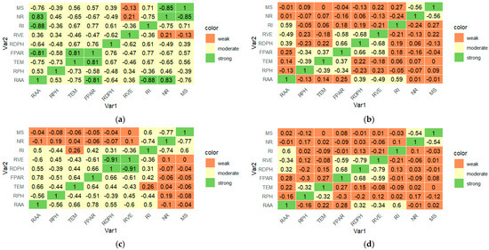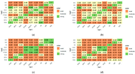 Spearman correlation coefficient of clutter features. (a) Sea State 2 (b) Sea State 5 (c) airborne test data 2 (d) airborne test data 8.