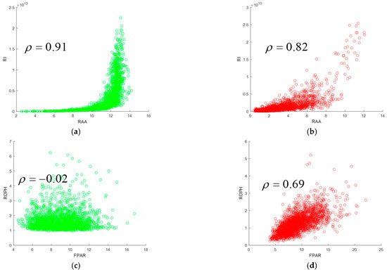 Scatter distribution of two sets of target features under different sea states. (a) RAA and RI, Sea State 2 (b) RAA and RI, Sea State 5 (c) FPAR and RDPH, Sea State 2 (d) FPAR and RDPH, Sea State5.
