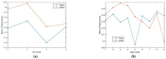 Variation of the average eigenvalue with changes in the scene. (a) Different sea states. (b) Different grazing angles.