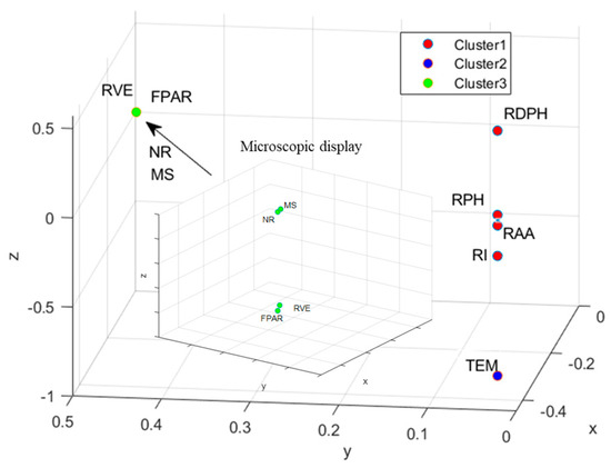 From Equation (32), it can be seen that as becomes smaller, the distance between features in the embedding space becomes smaller, meaning that they are more tightly clustered in the feature space. In fact, the embedding space mapping preprocesses the data, enabling better clustering performance. The first k smallest non-zero eigenvalues corresponding to the eigenvectors are selected, where k is the desired number of clusters. The average of the first six smallest eigenvalues of the feature Laplacian matrix under different scenarios is shown in Figure 16. It can be observed that the average eigenvalue of the target is smaller than that of the clutter in most scenarios, indicating that the target features are more clustered in the embedding space, and its correlation coefficient matrix is more suitable for clustering. In scenarios where the ground clearance angle is larger, the average eigenvalue of the clutter is smaller than that of the target. However, considering that clutter is often more clustered in the feature space while the target is more dispersed, prioritizing the target’s feature expression is more valuable for distinguishing between target and clutter. Therefore, in clustering, this paper selects the correlation coefficient matrix of the target for clustering.