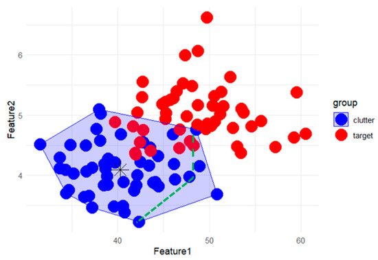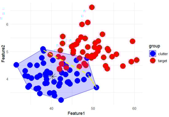 In performing the second step, the mean coordinates of the clutter sample points can be calculated to determine the sample cluster region. However, since the features used in this method are not fixed and have inconsistent magnitudes, directly calculating the Euclidean distance can lead to the removal of points that are farthest in one-dimensional distance along the feature with the largest magnitude, as shown by the green dashed line in Figure 20. This could result in the convex hull after removing false alarm points not effectively improving the target detection probability. Therefore, by normalizing the distance component of each feature dimension before calculating the Euclidean distance between the sample points and the center, as shown in Equation (38), the sample points farthest from the convex hull center can be effectively removed, as shown by the yellow dashed line in Figure 21. This normalization avoids the impact of feature magnitudes on the detection.