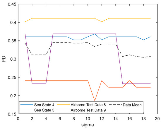 In Equation (27) for constructing the similarity matrix, the parameter can be adjusted to control the similarity between data points, allowing adaptation to different datasets and clustering requirements. The range of is set between 0.1 and 10. Performance curves for sea states level 4 and level 5, as well as for airborne test data 8 (approximately 68–77° grazing angle) and airborne test data 9 (approximately 77–82° grazing angle), are plotted in Figure 22. From the average detection probabilities of several datasets, as indicated by the black dashed lines in the figure, it can be observed that the proposed detector generally achieves the best detection performance when is set between 0.6 and 1. To simplify the parameter configuration, is uniformly used in subsequent analyses.